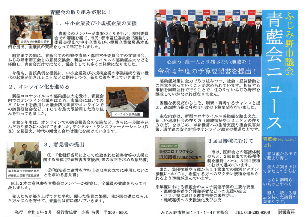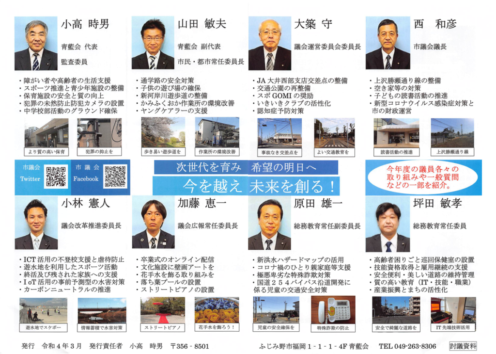 2022年3月28日 / 最終更新日 : 2022年3月28日 ad-harada@ 議員活動 ふじみ野市議会 青藍会ニュース(令和4年3月) 次世代を育み希望の明日へ 今を越え未来を創る! 今年度の青藍会の活動、会派メンバー並びに原田の取り組みと一般質問内容をご紹介しています。 新洪水ハザードマップの活用 コロナ禍のひとり親家庭等支援 極悪卑劣な特殊詐欺対策 国道254バイパス沿道開発に係る児童の交通安全対策 ◎ PDF版はこちらからご覧頂けます。 RSS購読はこちらへ! @haradayuichi1 FacebookXHatenaPocketCopy