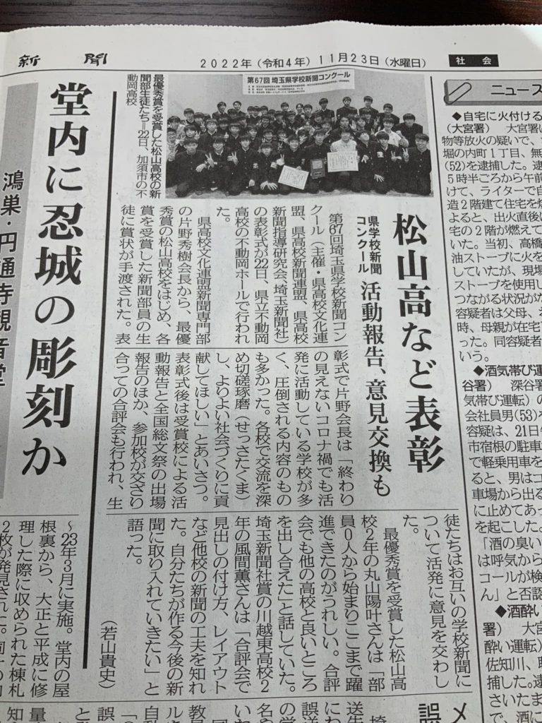 2022年11月24日 / 最終更新日 : 2022年11月24日 ad-harada@ 日常雑記 埼玉県学校新聞コンクール 最優秀賞受賞 昨日の埼玉新聞です。 母校の松山高校が、埼玉県学校新聞コンクールで見事最優秀賞を受賞しました。 ワールドカップのドイツ戦勝利と併せて、嬉しい限りです。 RSS購読はこちらへ! @haradayuichi1 FacebookXHatenaPocketCopy